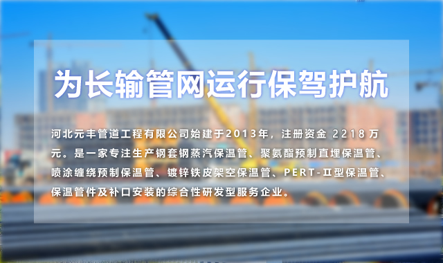 河北元豐管道工程有限公司始建于2013年,注冊資金2218萬元。是一家專注生產(chǎn)鋼套鋼蒸汽保溫管、聚氨酯預(yù)制直埋保溫管、噴涂纏繞預(yù)制保溫管、鍍鋅鐵皮架空保溫管、PERT-Ⅱ型保溫管、保溫管件及補(bǔ)口安裝的綜合性研發(fā)型服務(wù)企業(yè)。