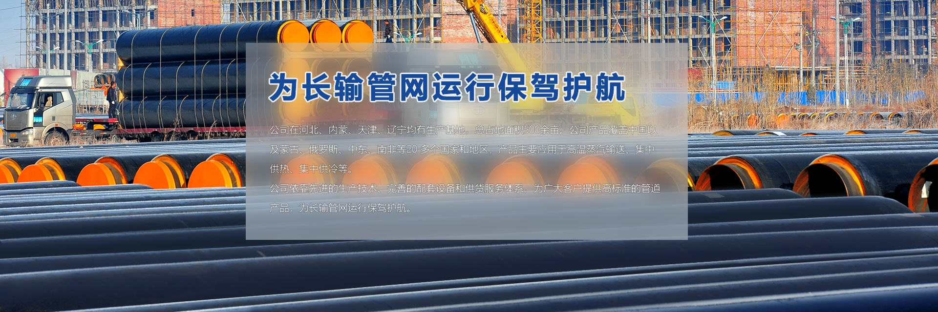 公司在河北、內(nèi)蒙、天津、遼寧均有生產(chǎn)基地,總占地面積500余畝。公司產(chǎn)品覆蓋中國以及蒙古、俄羅斯、中東、南非等20 多個國家和地區(qū),產(chǎn)品主要應(yīng)用于高溫蒸汽輸送、集中供熱、集中供冷等。 公司依靠先進(jìn)的生產(chǎn)技術(shù)、完善的配套設(shè)備和供貨服務(wù)體系,為廣大客戶提供高標(biāo)準(zhǔn)的管道產(chǎn)品,為長輸管網(wǎng)運(yùn)行保駕護(hù)航。